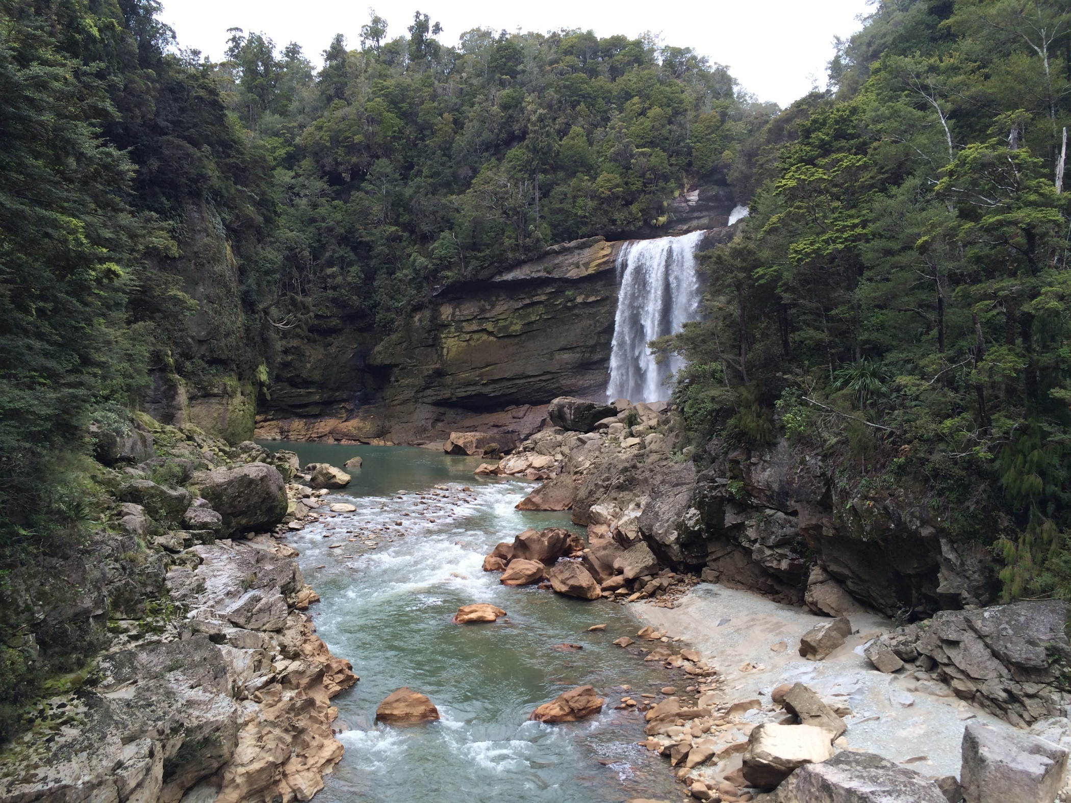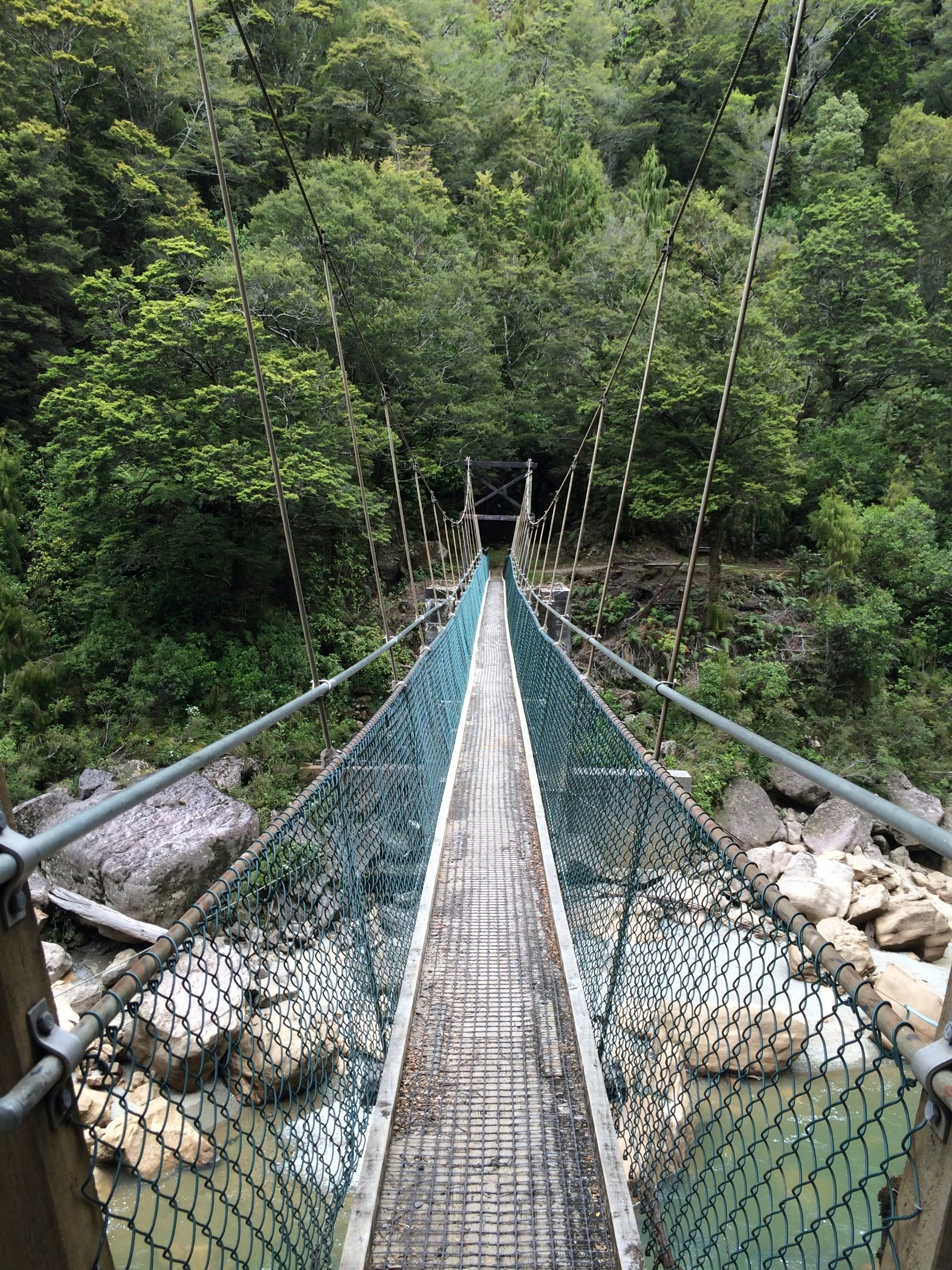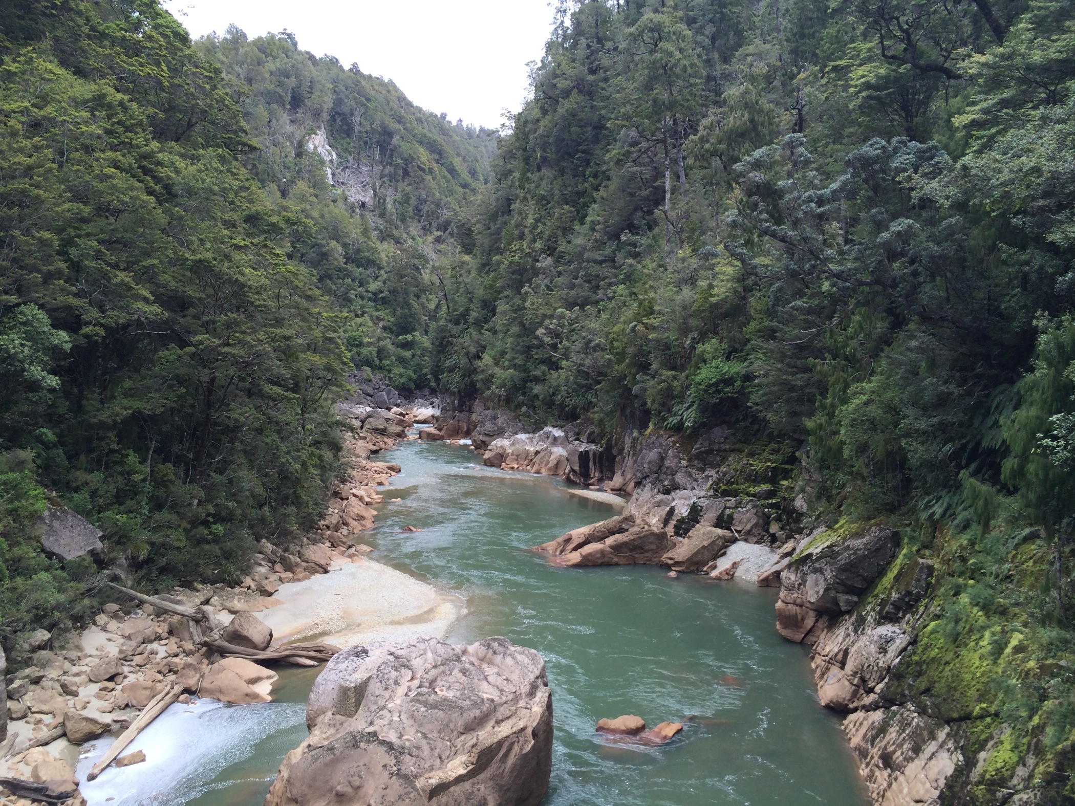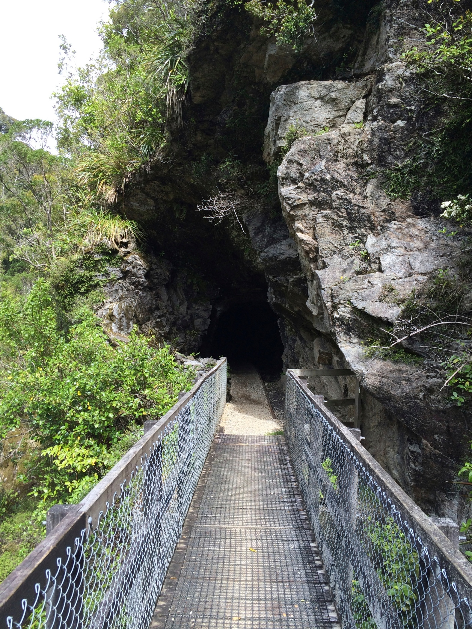This is Charming Creek Walkway another walk from the New Zealand Frenzy. It is a railway line that follows the route of an old timber and coal mines. It was a really good walk with a couple of tunnels several waterfalls a suspension bridge. The river was an amazing cloudy blue colour and was quite fast flowing with lots of boulders in it. it looked like it would make a good white water rafting river. Just near the end of the walk two rivers join, the second river is a tannin brown colour and where the rivers meet you can see the current as the coloured water swirl around each other. The stop for the walk was at an old mill although not much left now just information boards for Gareth. We clambered down the bank to try and get a look at a smaller waterfall that we could hear but the bush was to thick at that point to see through but couldn't get close enough to see it.