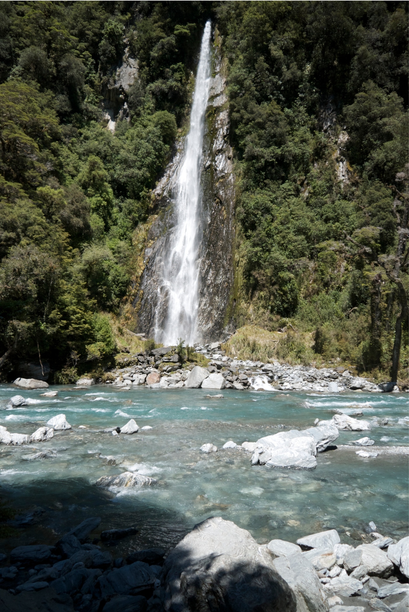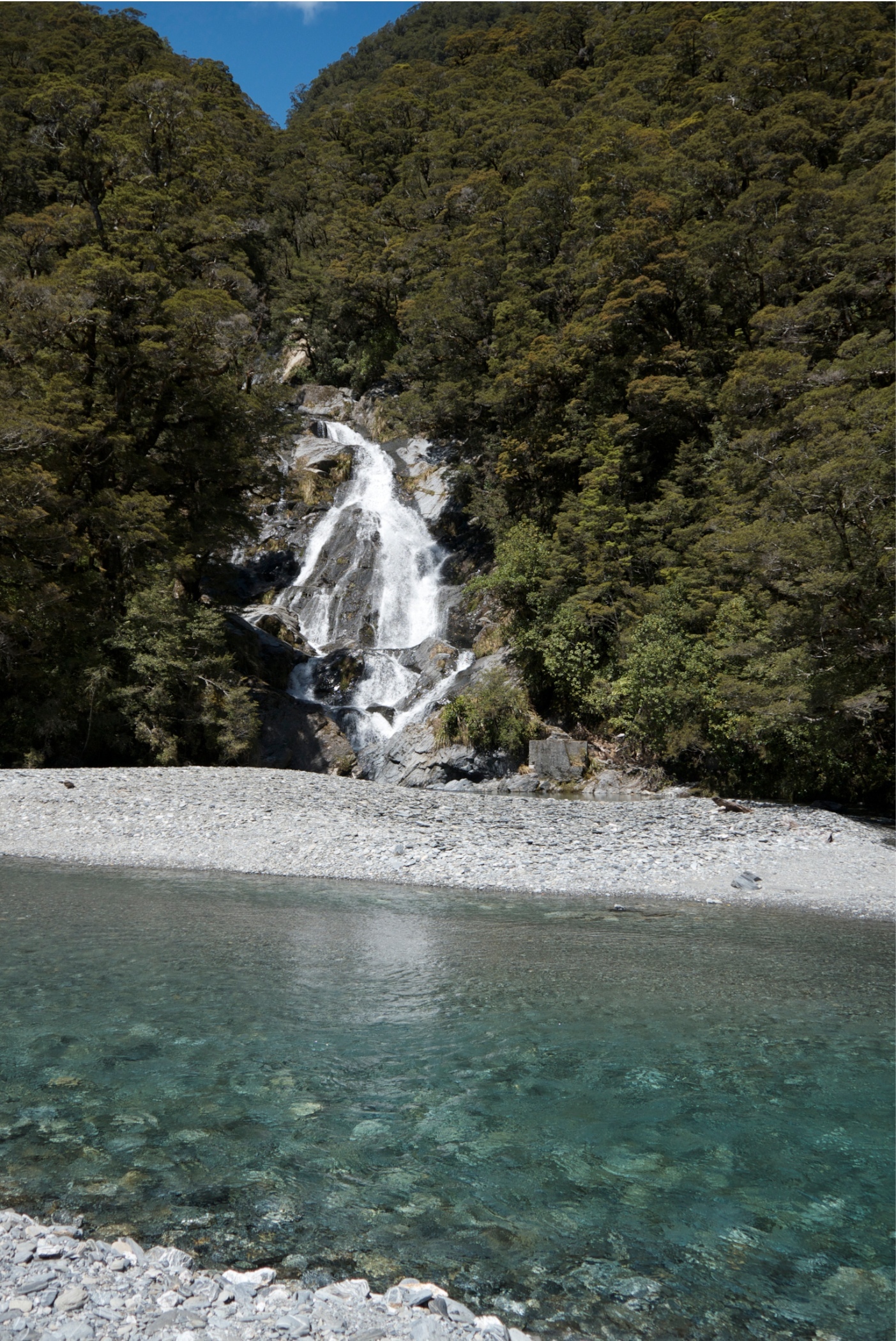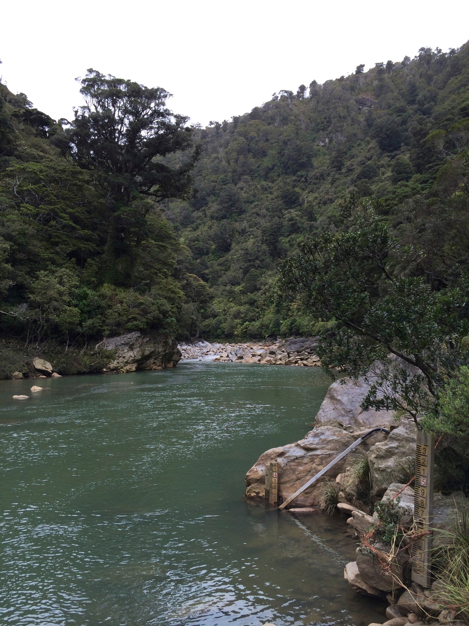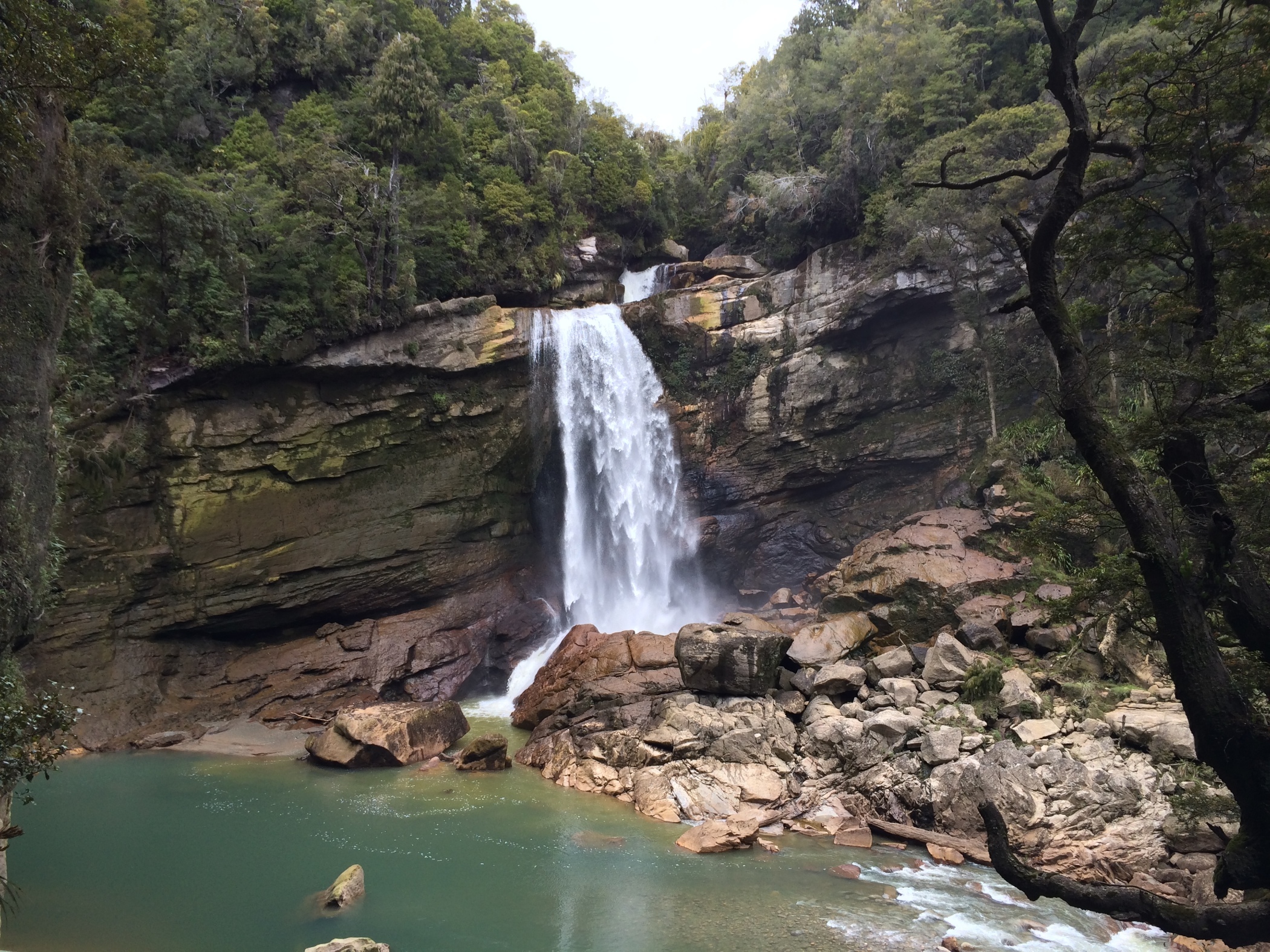 This is Charming Creek Walkway another walk from the New Zealand Frenzy. It is a railway line that follows the route of an old timber and coal mines. It was a really good walk with a couple of tunnels several waterfalls a suspension bridge. The river was an amazing cloudy blue colour and was quite fast flowing with lots of boulders in it. it looked like it would make a good white water rafting river. Just near the end of the walk two rivers join, the second river is a tannin brown colour and where the rivers meet you can see the current as the coloured water swirl around each other. The stop for the walk was at an old mill although not much left now just information boards for Gareth. We clambered down the bank to try and get a look at a smaller waterfall that we could hear but the bush was to thick at that point to see through but couldn't get close enough to see it.