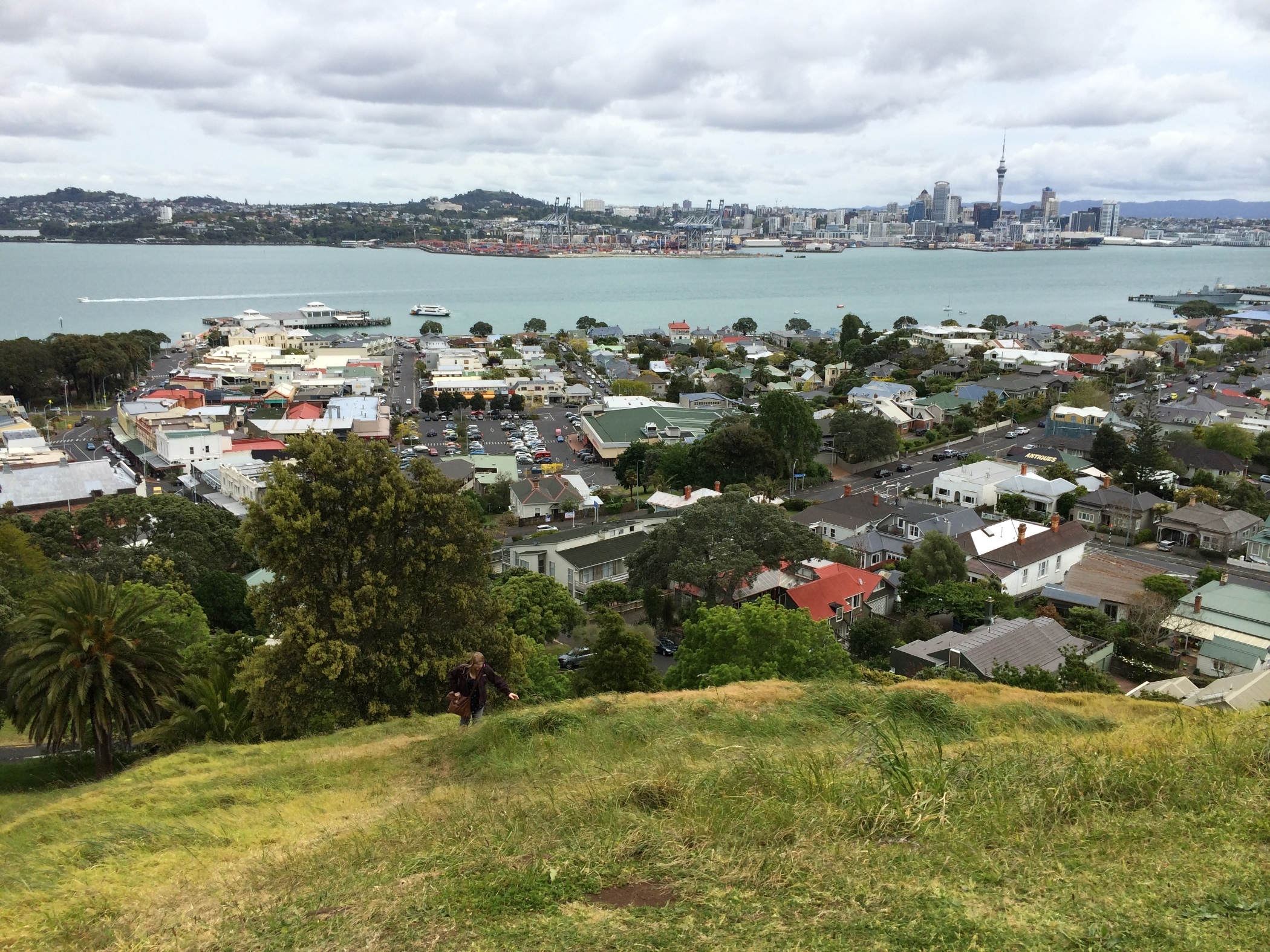 View from the top of Mount Victoria down to Devonport town and the ferry terminal and across to Auckland and the sky tower.