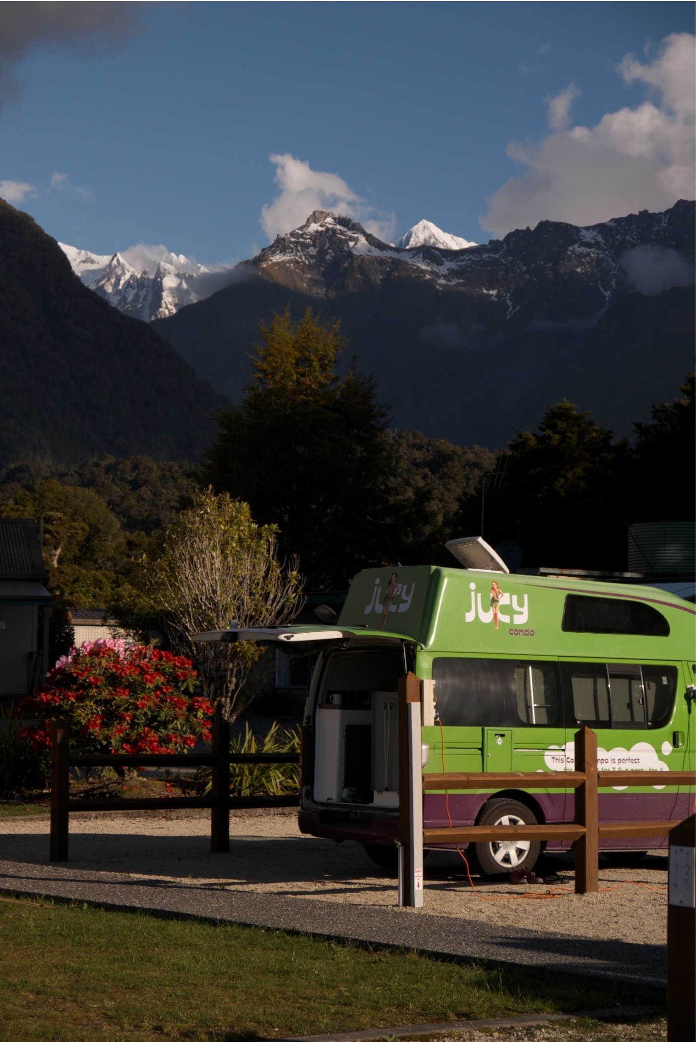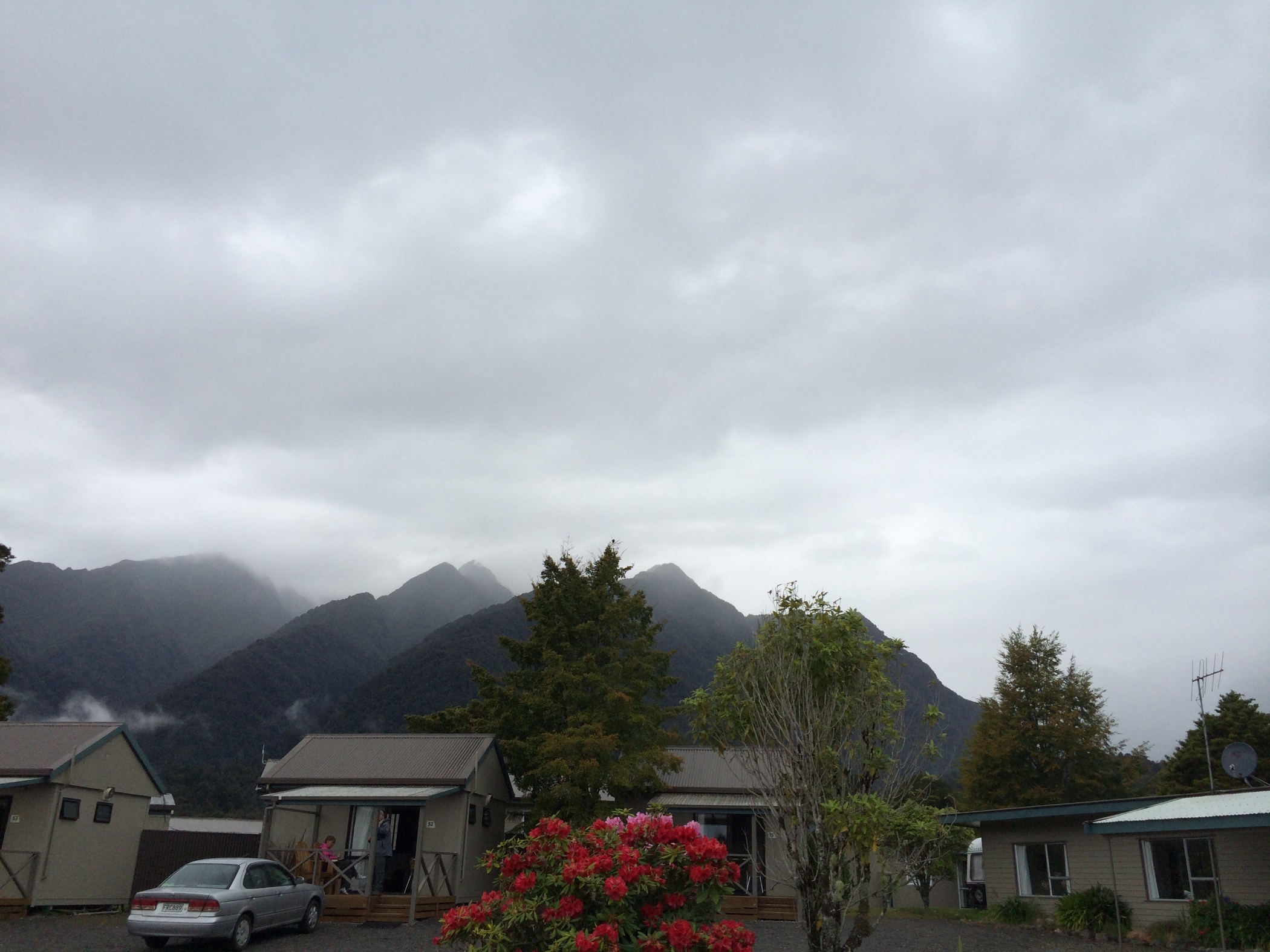 Today was grey and drizzley so made the drive a bit harder. Lots of windy mountain roads. It was still quite grey when we got to Fox Glacier holiday park so we had a quiet afternoon did some laundry and read our books before heading out for dinner. The cloud was quite beautiful drifting across the mountains revealing and hiding different views each minute.