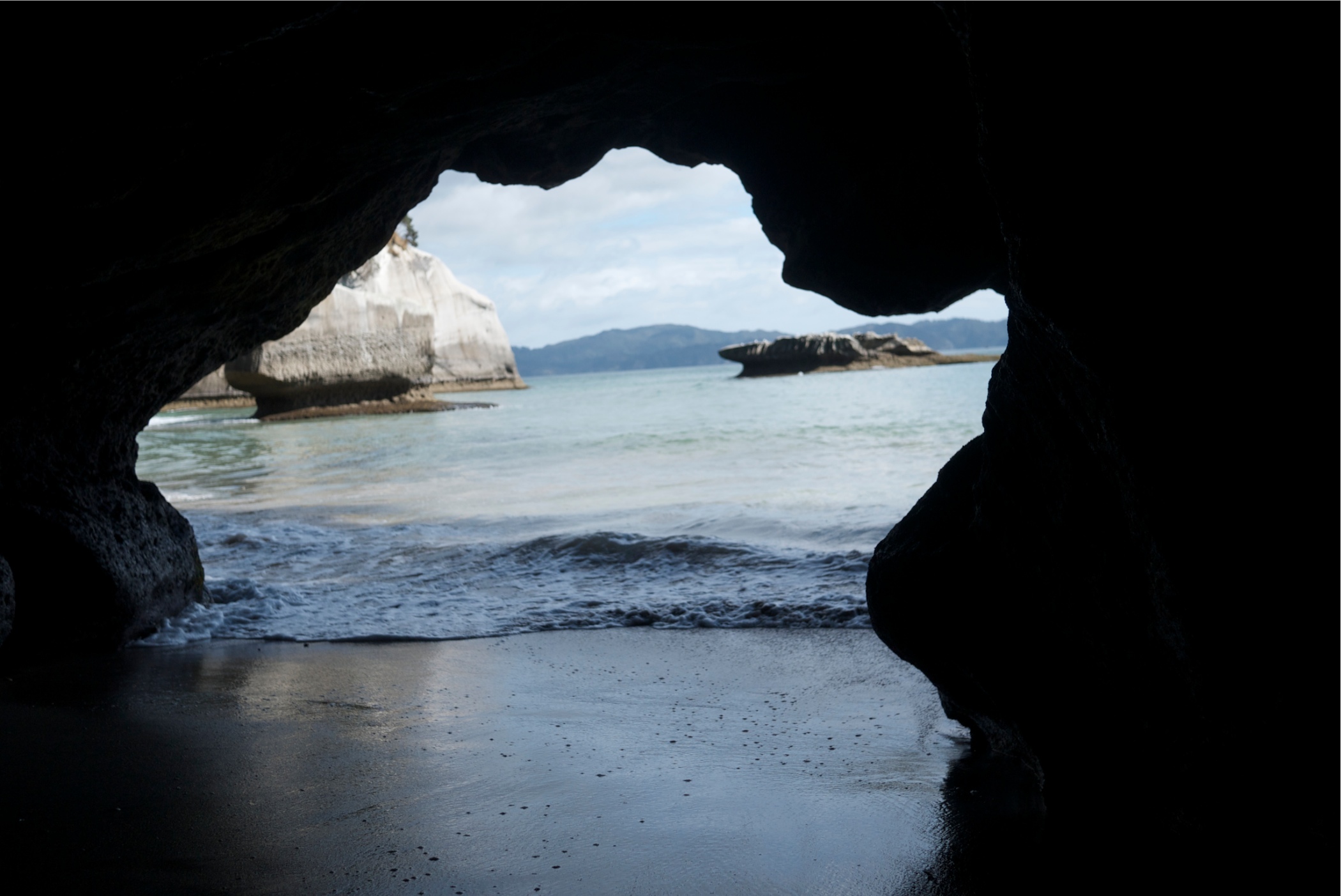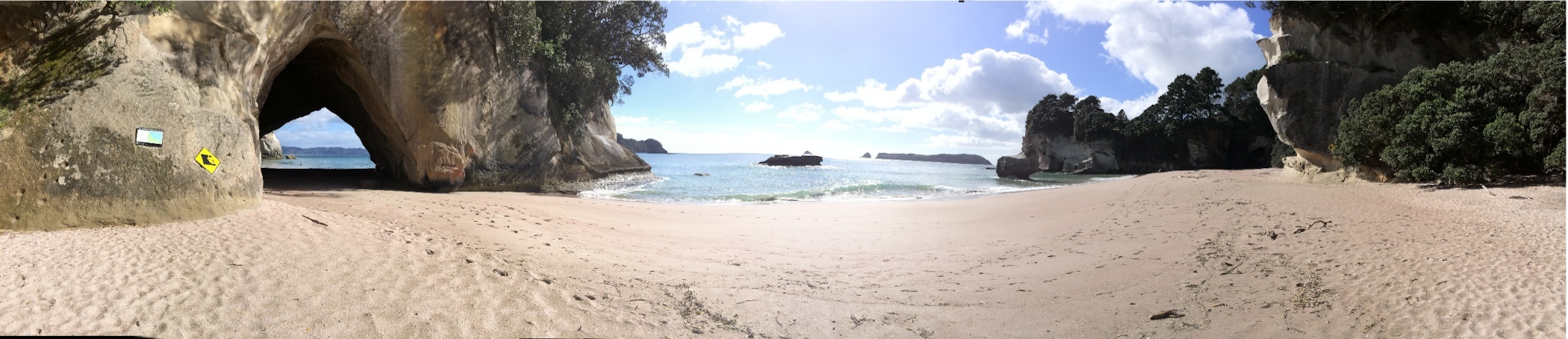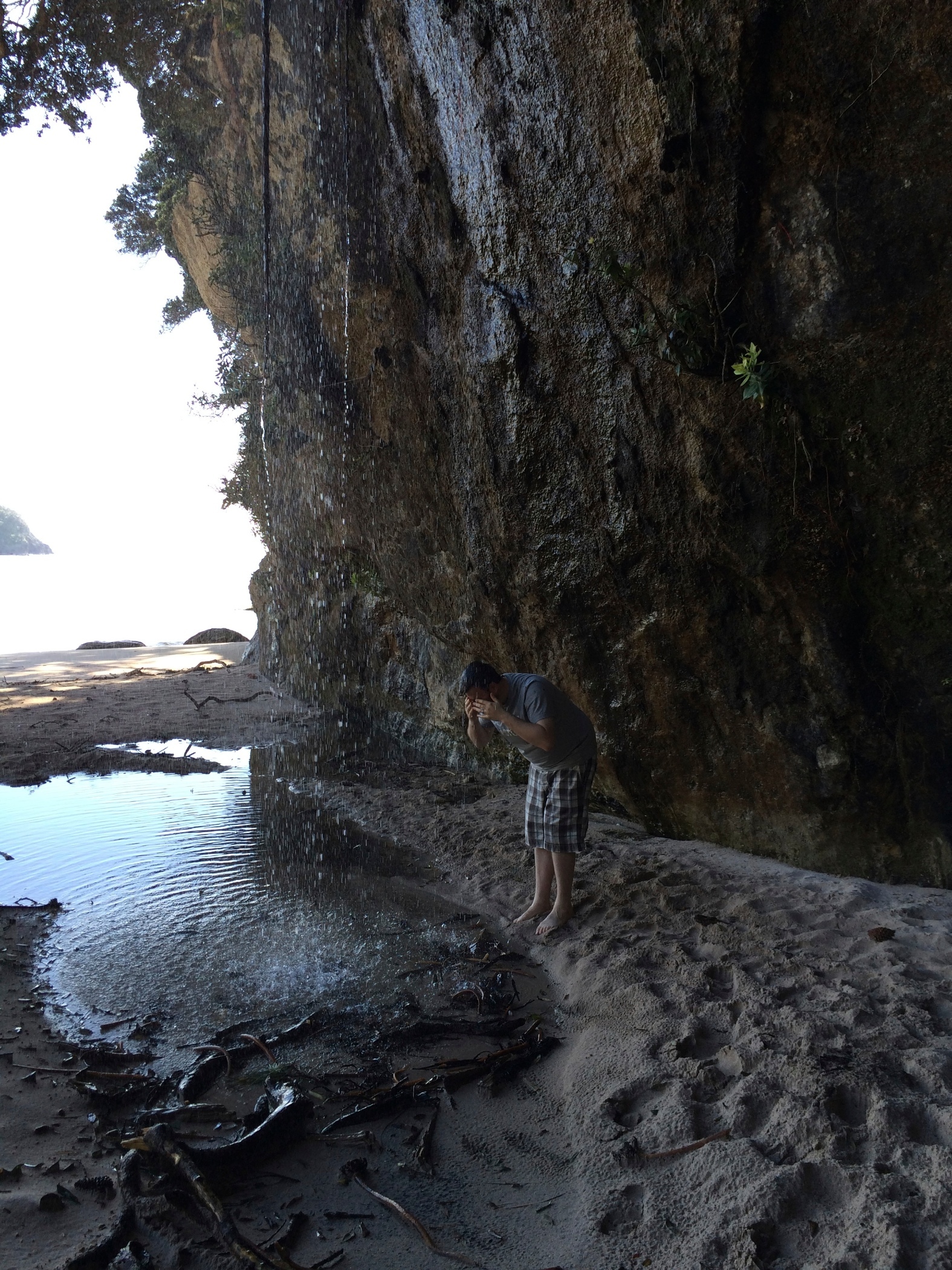 As low tide for digging our hot pool was from 10.00 onwards we decided to drive to cathedral cove just up the coast which is good to get before the crowds arrive. The walk to the cove takes about 30mins and is quite hilly. It is all worth it. Only 2 other people there to start. The sun was really warm the sea not so much, although we wished we had taken out swimsuit as Gareth had suggested. The beach also has a fresh water waterfall against one of the cliffs and a cave became accessible as the sea went out a bit further. We spent an hour exploring and taking pictures as more people arrived we headed back to the camper and back to Hot Water Beach.