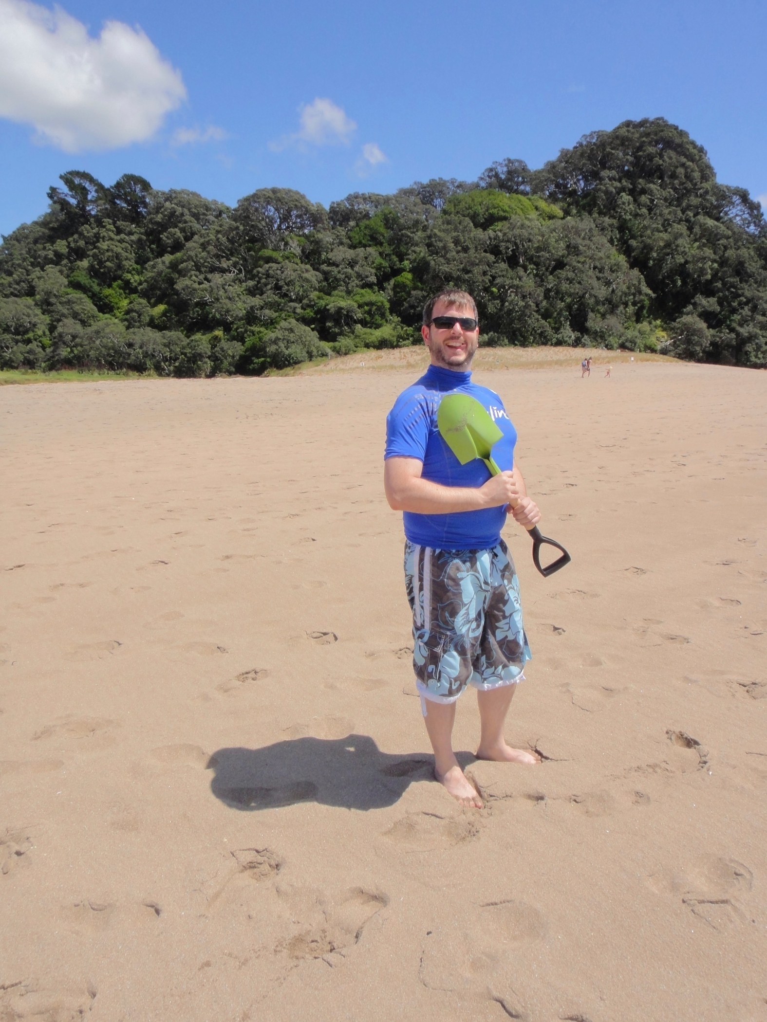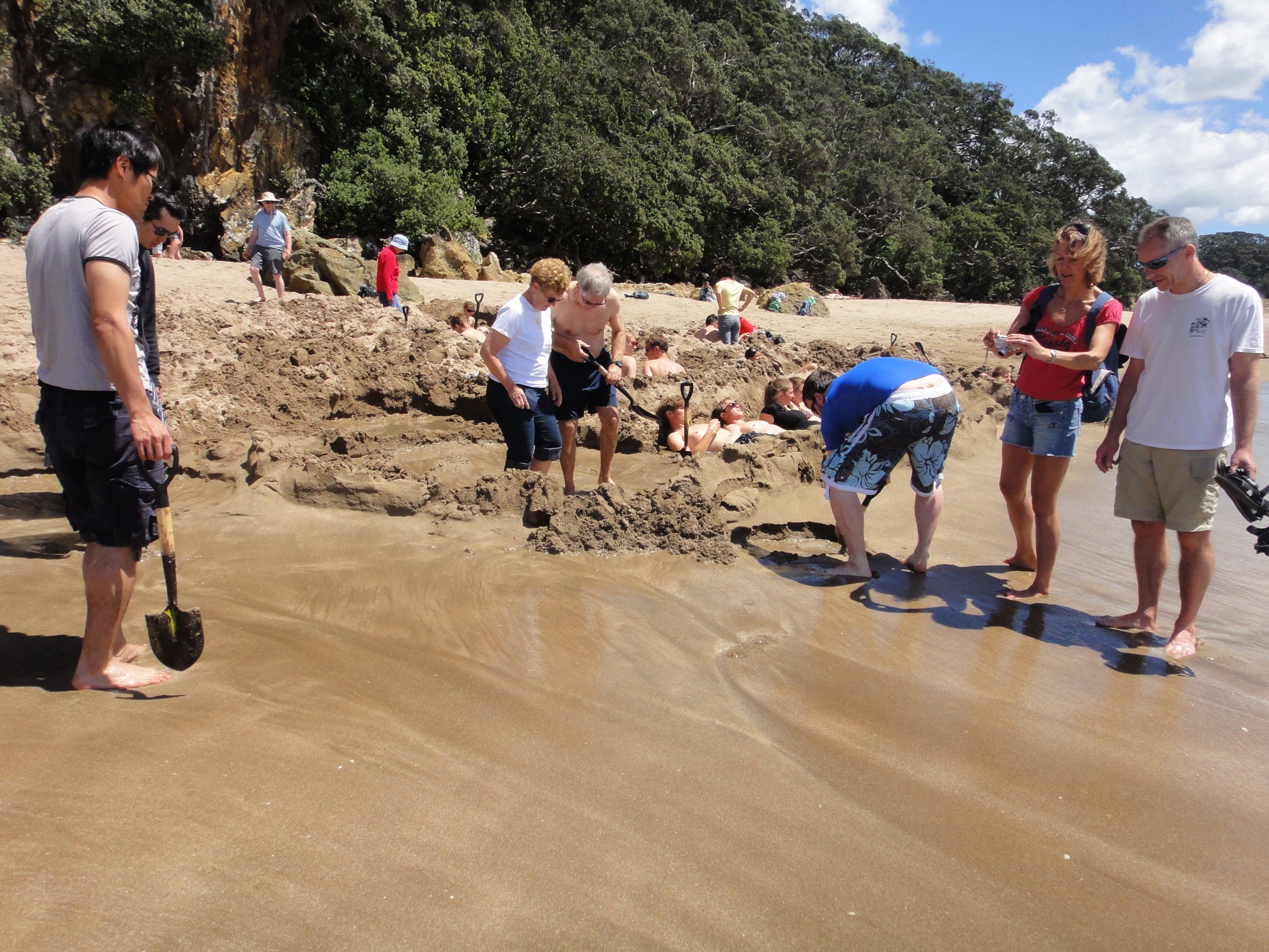 Back at Hot Water Beach, the tide was not a particularly low tide and there was a lot more people than we had expected, so we didn't manage to dig a proper pool but after a while we shared dipping our feet in a pool with an American couple. This pool was beginning to disappear as the tide was on its way back in. What the guide books don't tell you is that you need to dig directly by where the water bubbles through the sand.