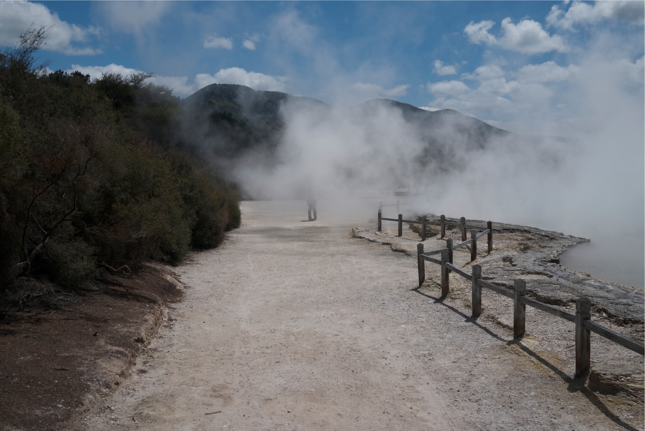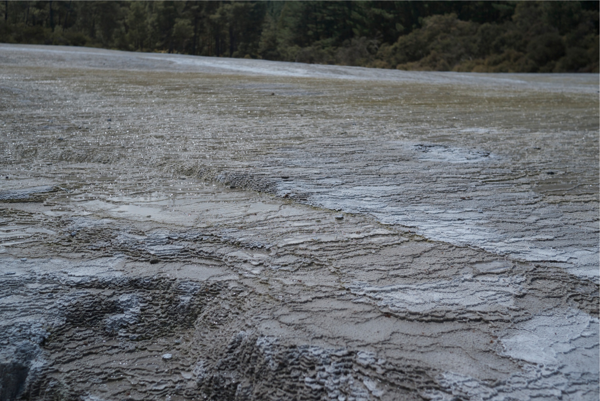 This is The Primrose Terrace they are the largest sinter terrace left in New Zealand. The water from the Champagne Pool flows over the terrace and as the water evaporates it deposits silica.