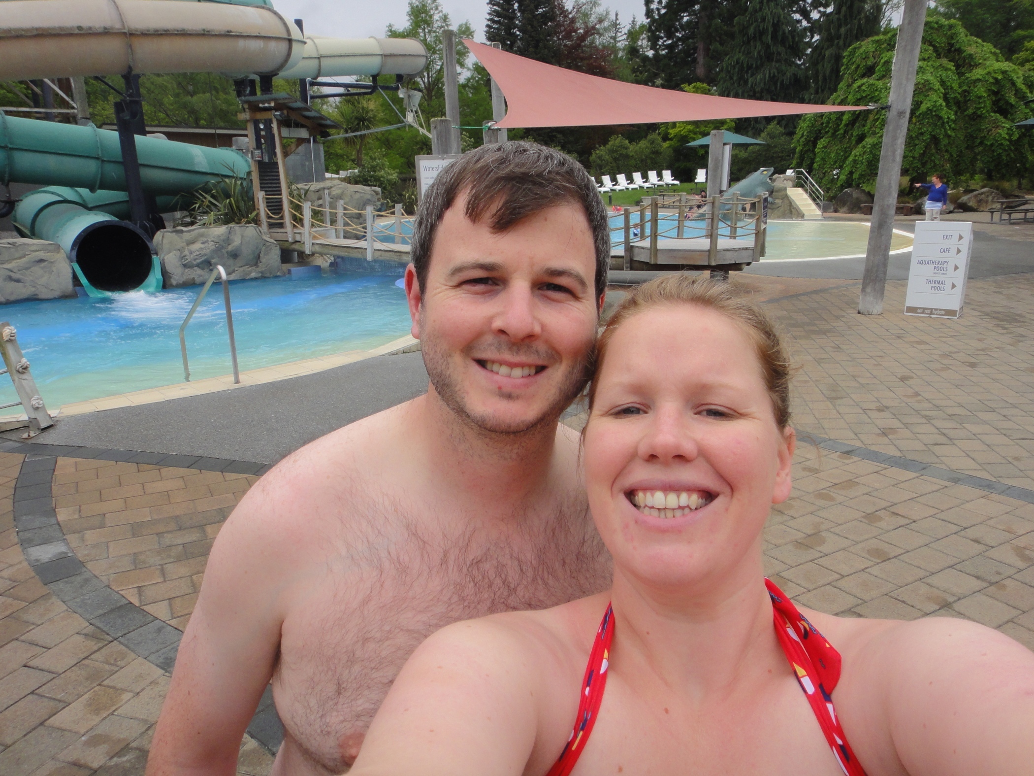 The day hasn't got any better it is damp and cold and the cloud is low. Went to the thermal pools which have flume slides as well as a variety of temperature pools. The slides were great fun although a little weird to be in water as warm as a bath.
