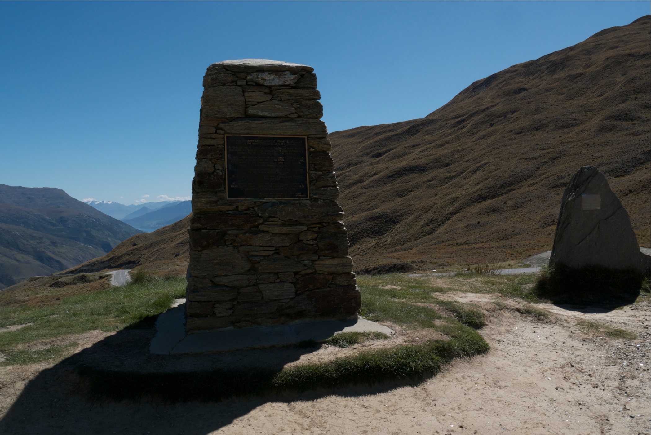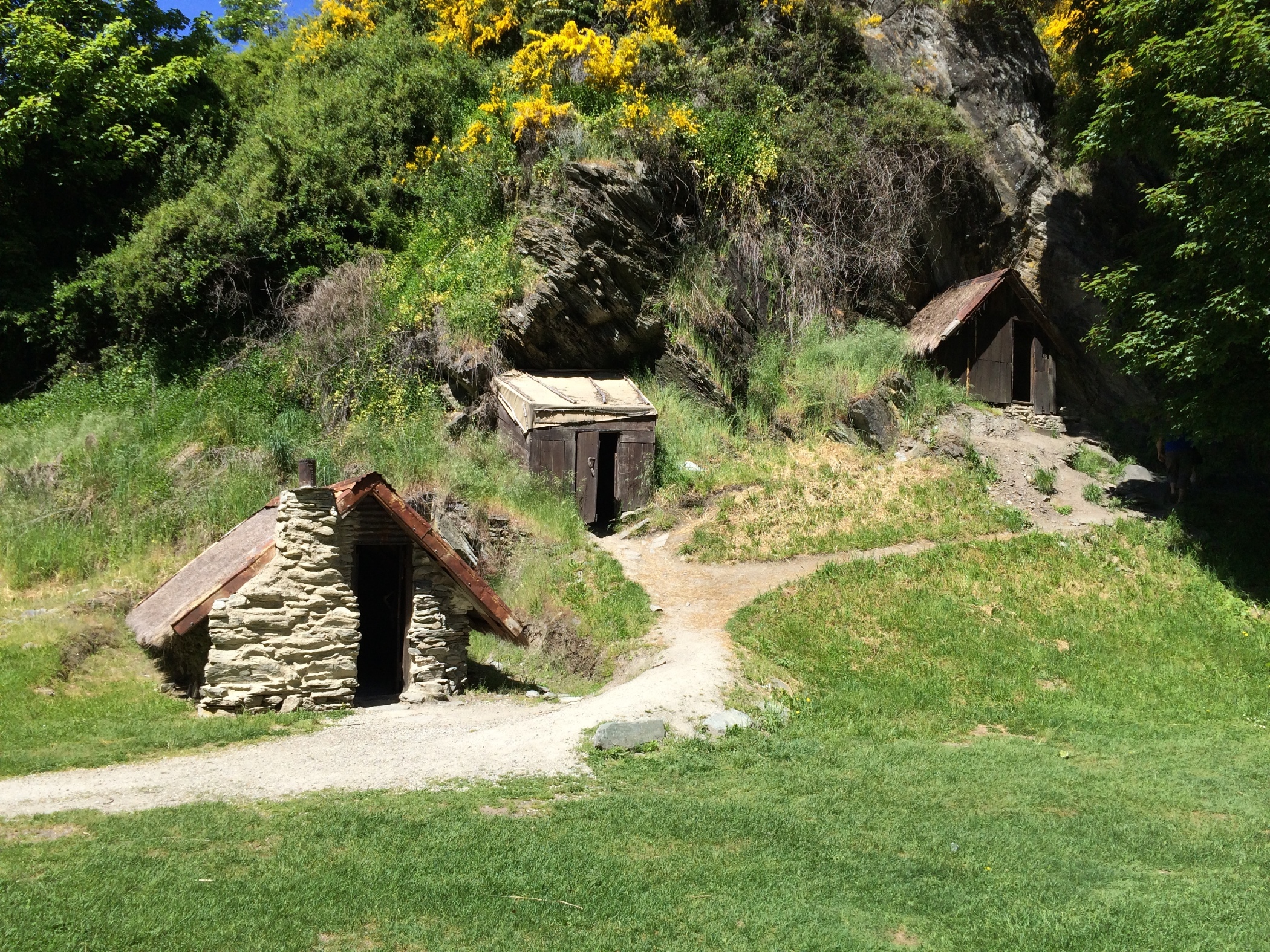 Long drive day today. Made a few stops. Bruce Bat to make stone sculptures. Thunder falls fan tail falls. Look out point for NZ highest sealed road then down into Arrowtown. Stayed in a lovely little motel. Needed a night in a bed and dinner in a pub garden.