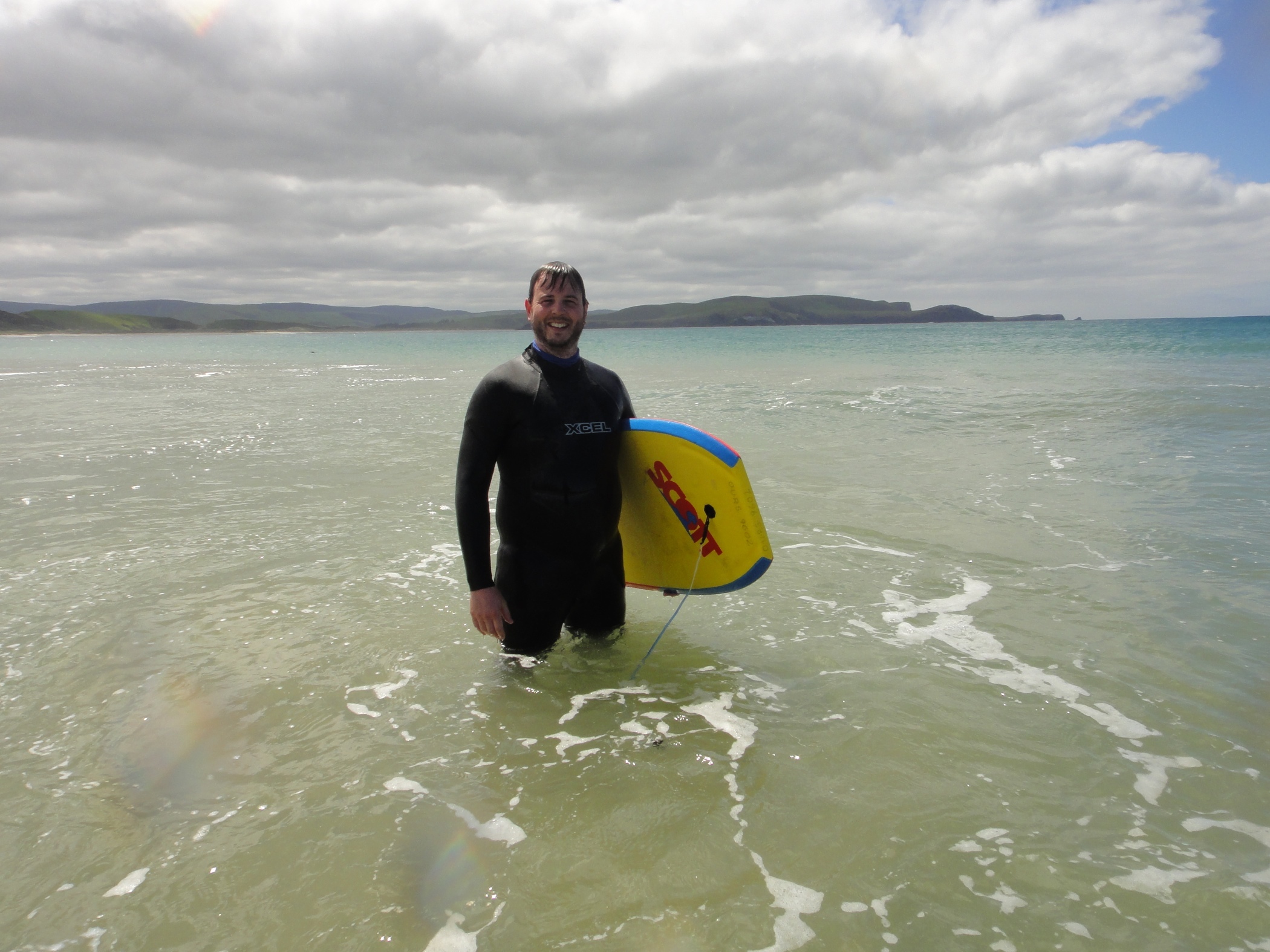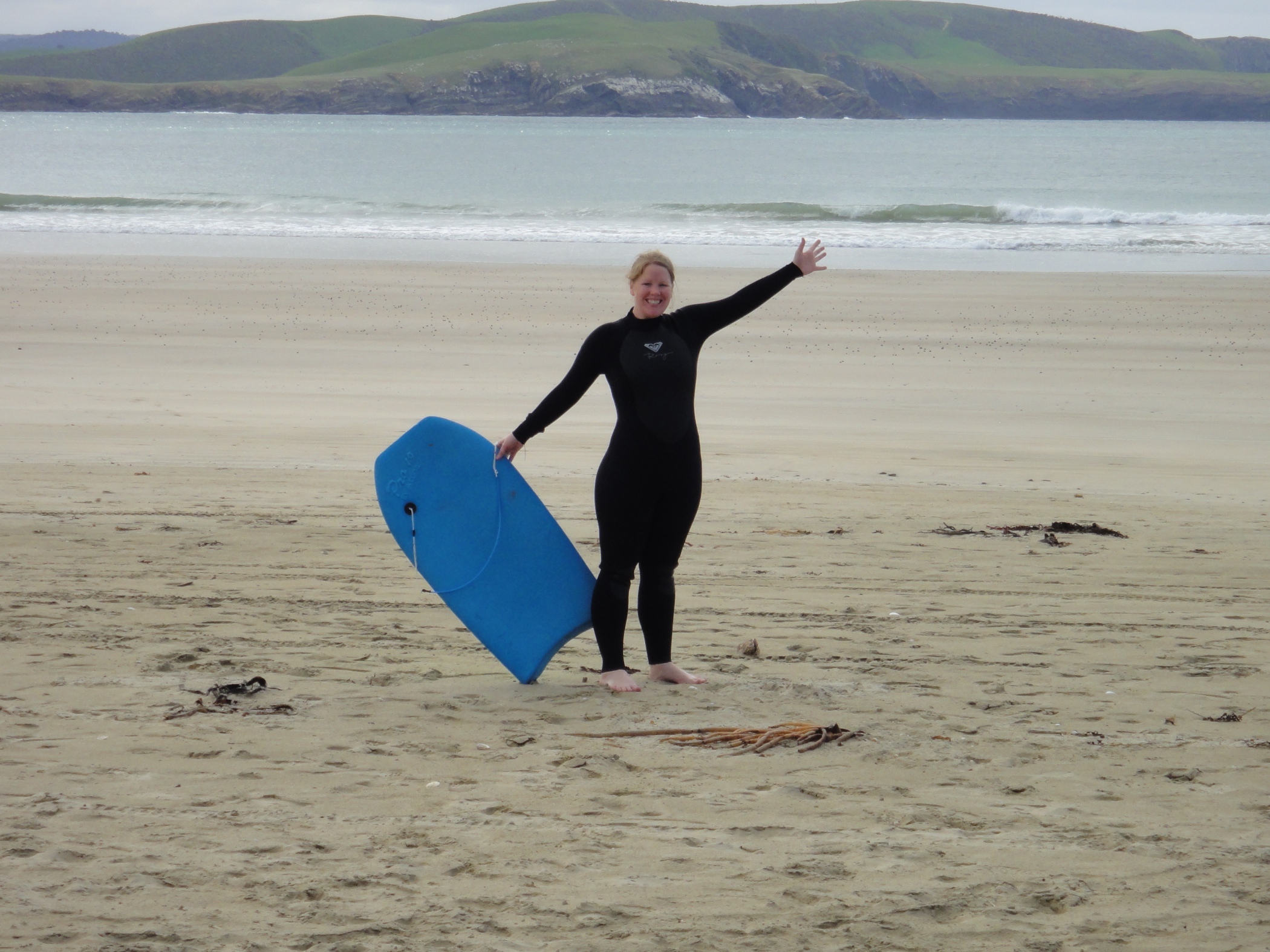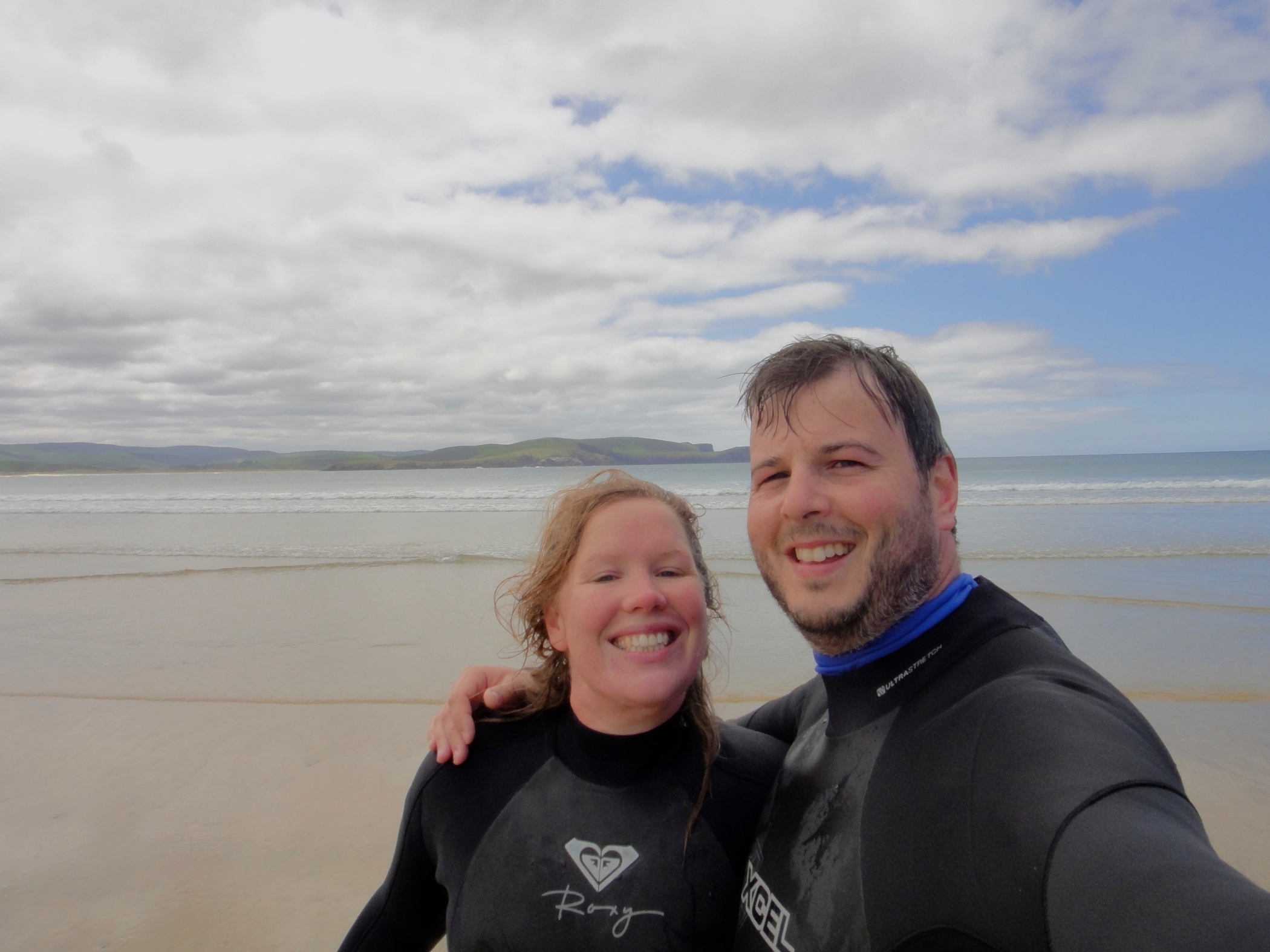 Had breakfast sat looking over Porpoise Bay and could see the Hector dolphins swimming around the cove. They were much closer to the shore than we had expected. Went for a walk along the shore before deciding to try and rent wetsuits and board to swim out.