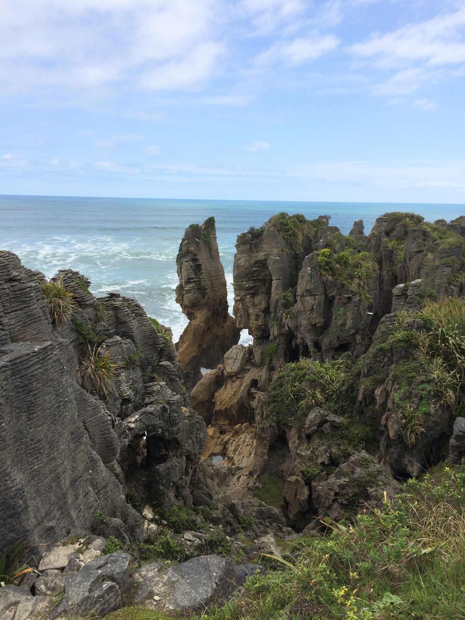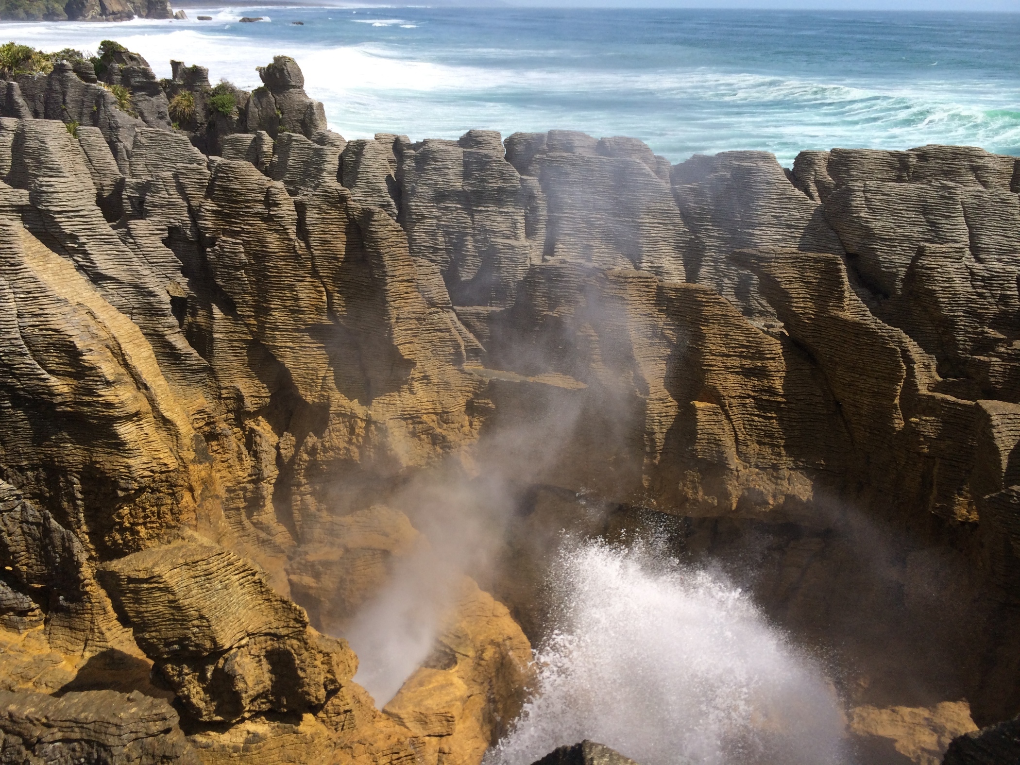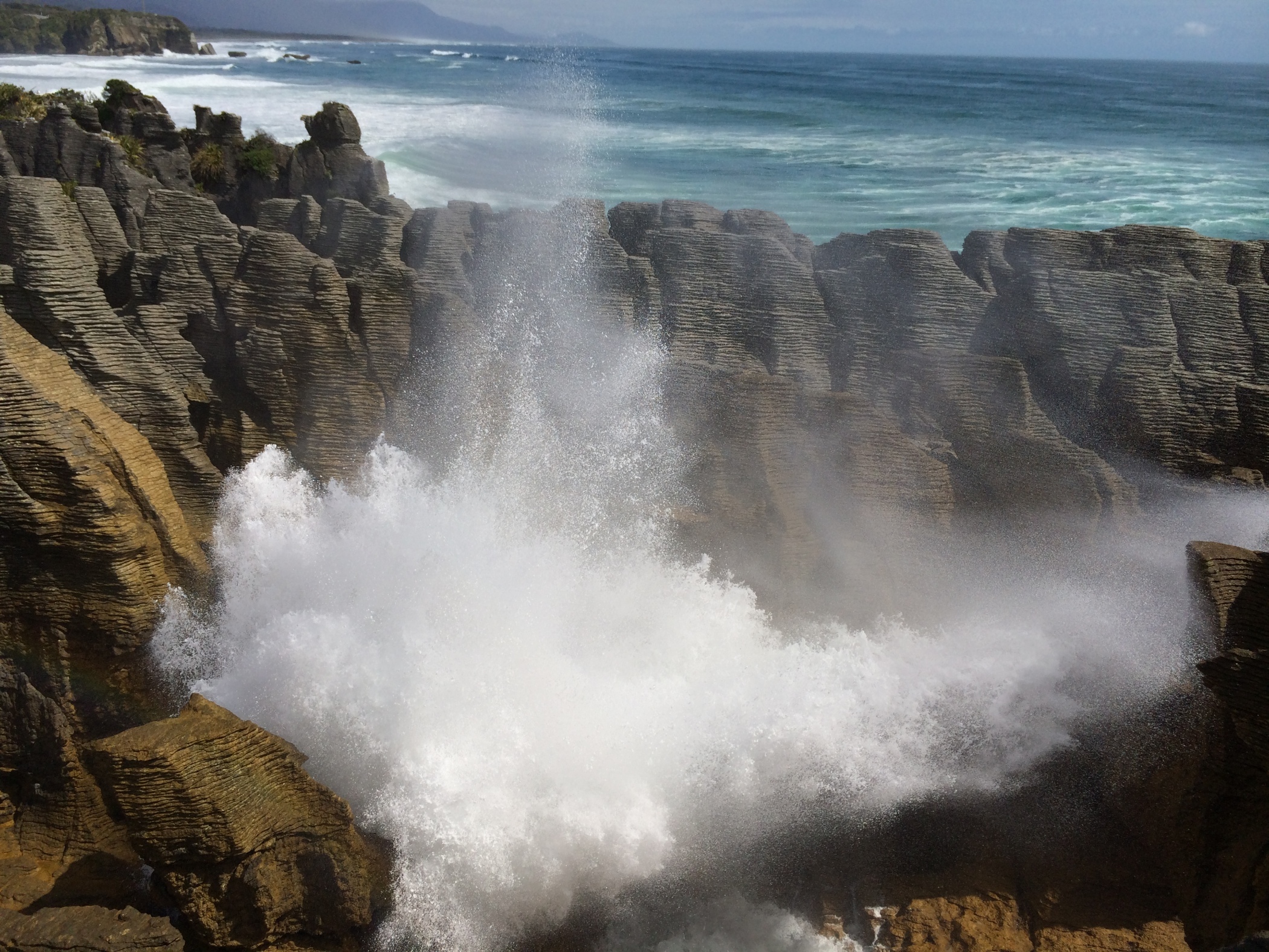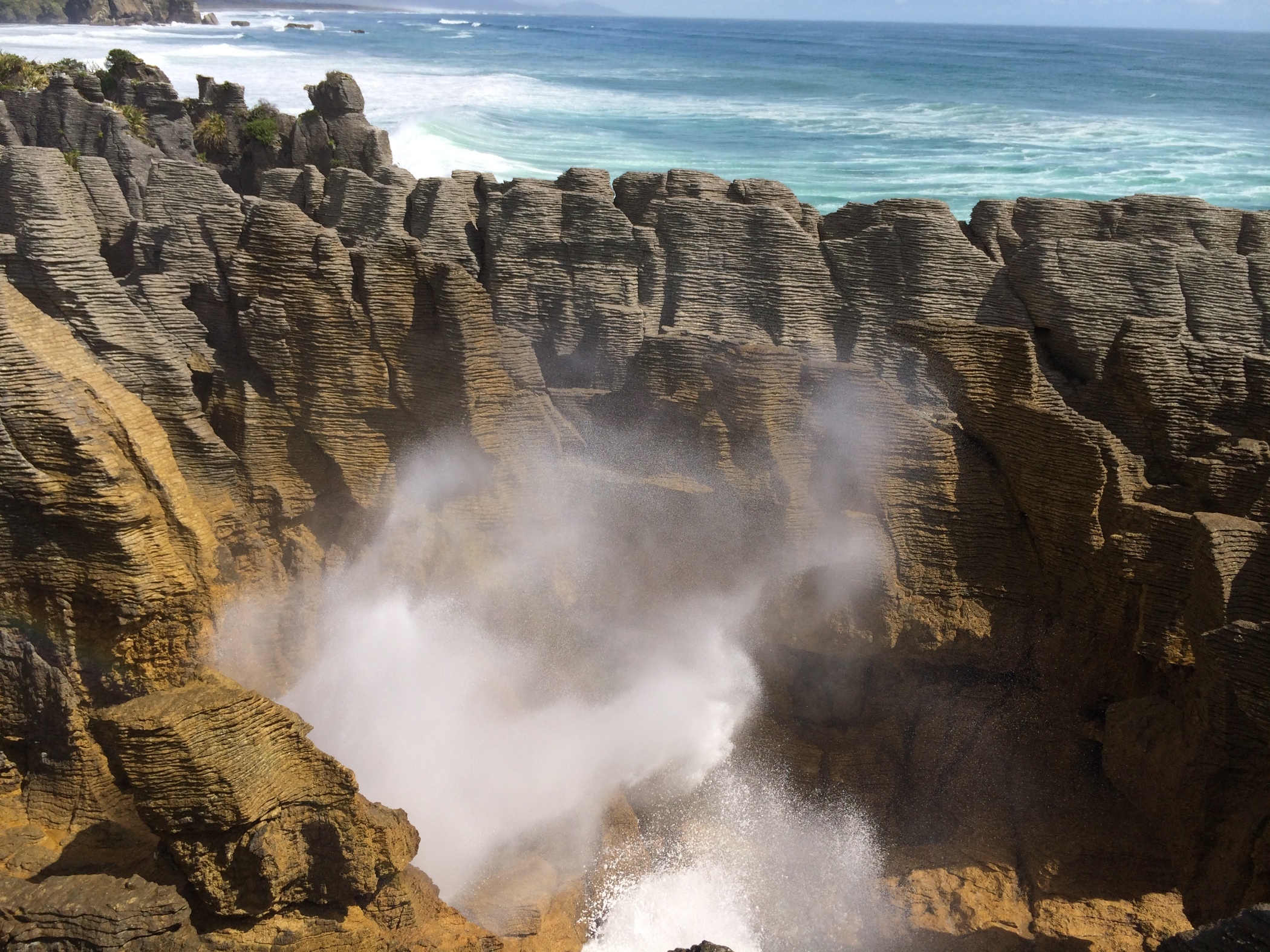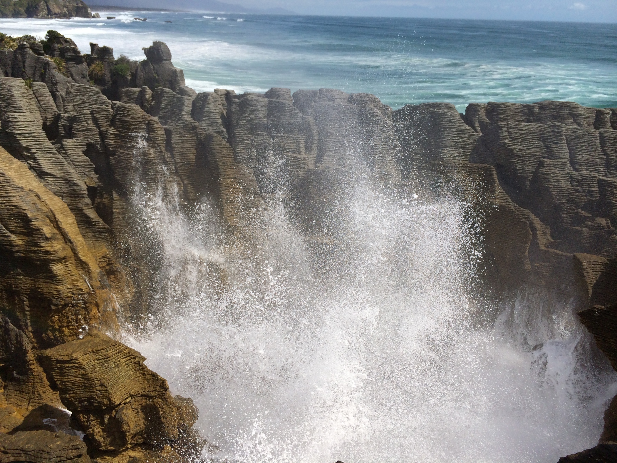 The sound of the waves crashing up against the cliff is an amazing booming sound. Back in the camper van and on a bit further to Punakaiki and the pancake rocks and blow holes.