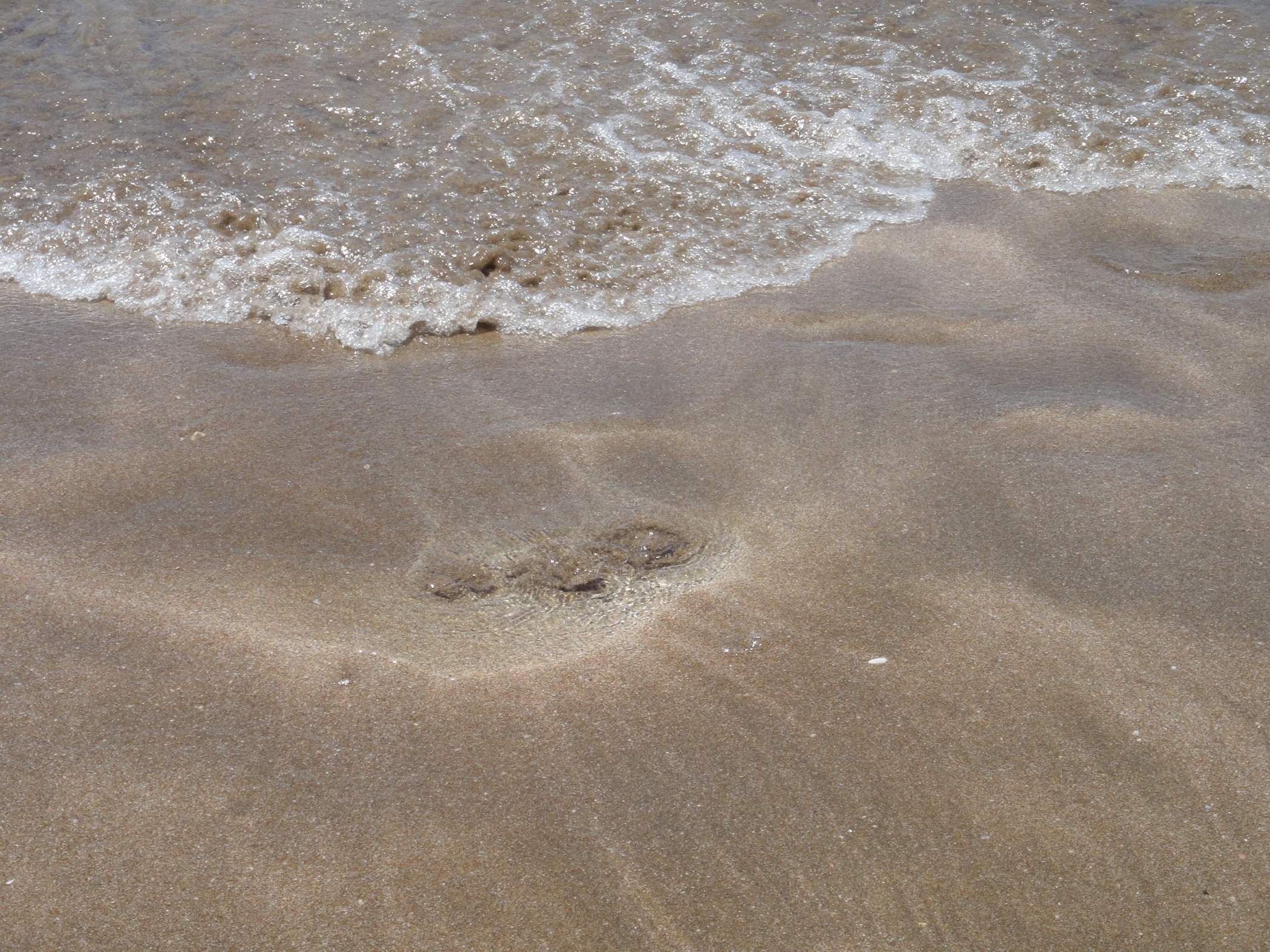 This is the hot spring source. The water coming up through the sand is too hot to stand in but if you stand near it as the sea washes in and over it it becomes warm like bath water.