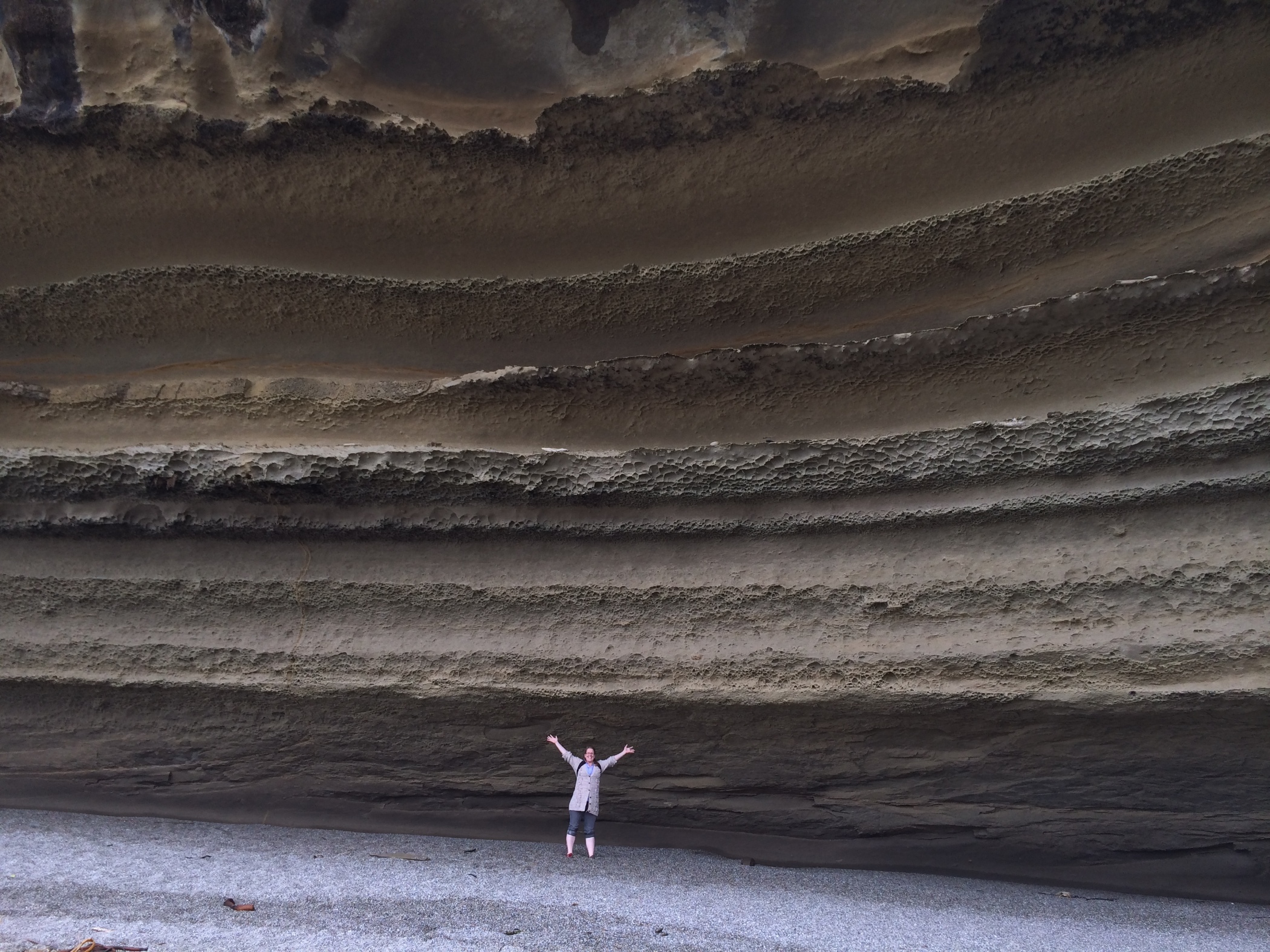 This beach is only accessible at mid to low tide. It's a beautifully sculpted beach with a waterfall coming straight off the cliff at the far end. Not sandy just a tiny pebble beach. The tide turned really quickly I can see how easy it is to get caught out. We both got wet feet and trousers from underestimating how far the tide would come in.