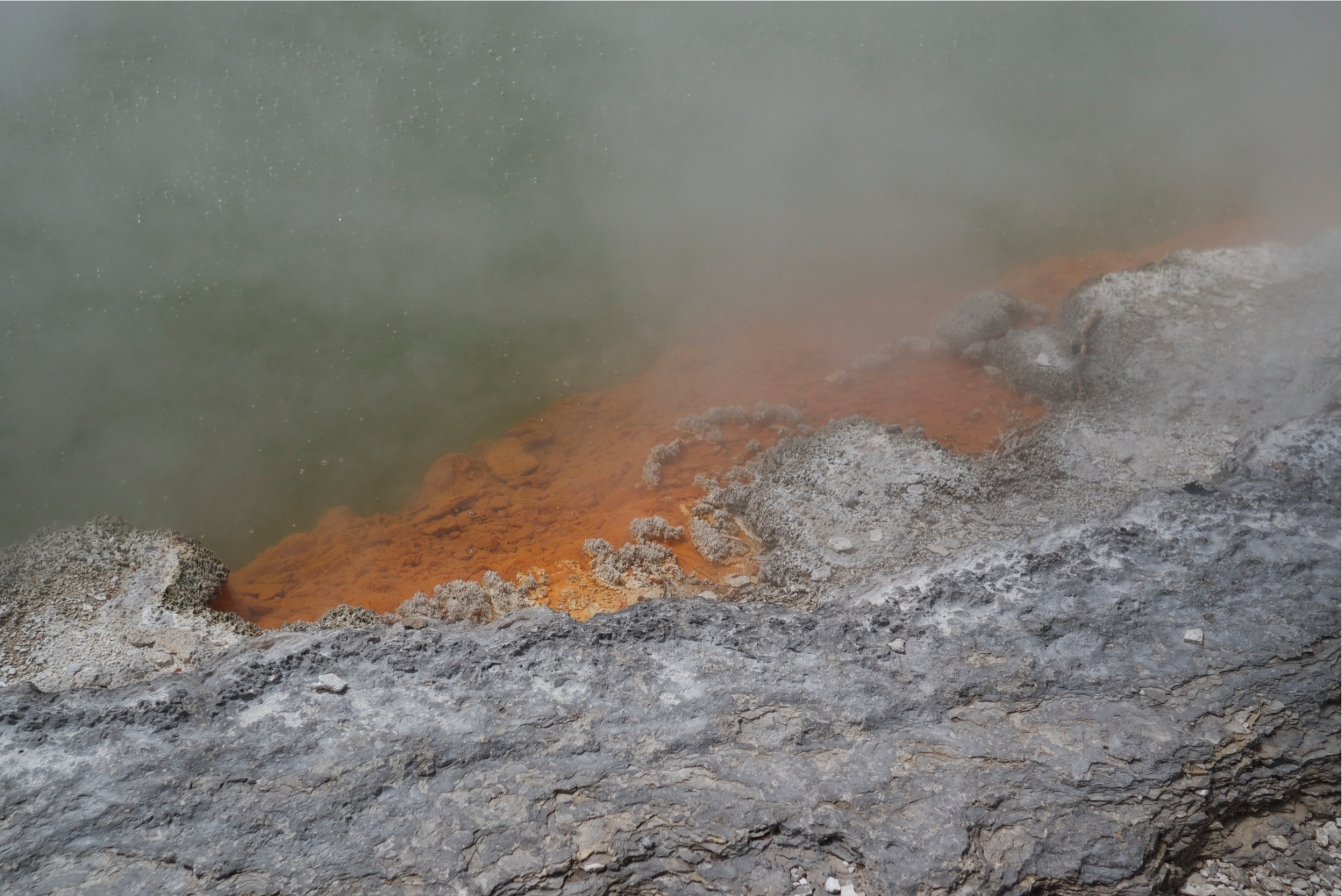 The edge of the Champagne Pool. The various sinter levels of the pool are caused by earthquake activity.