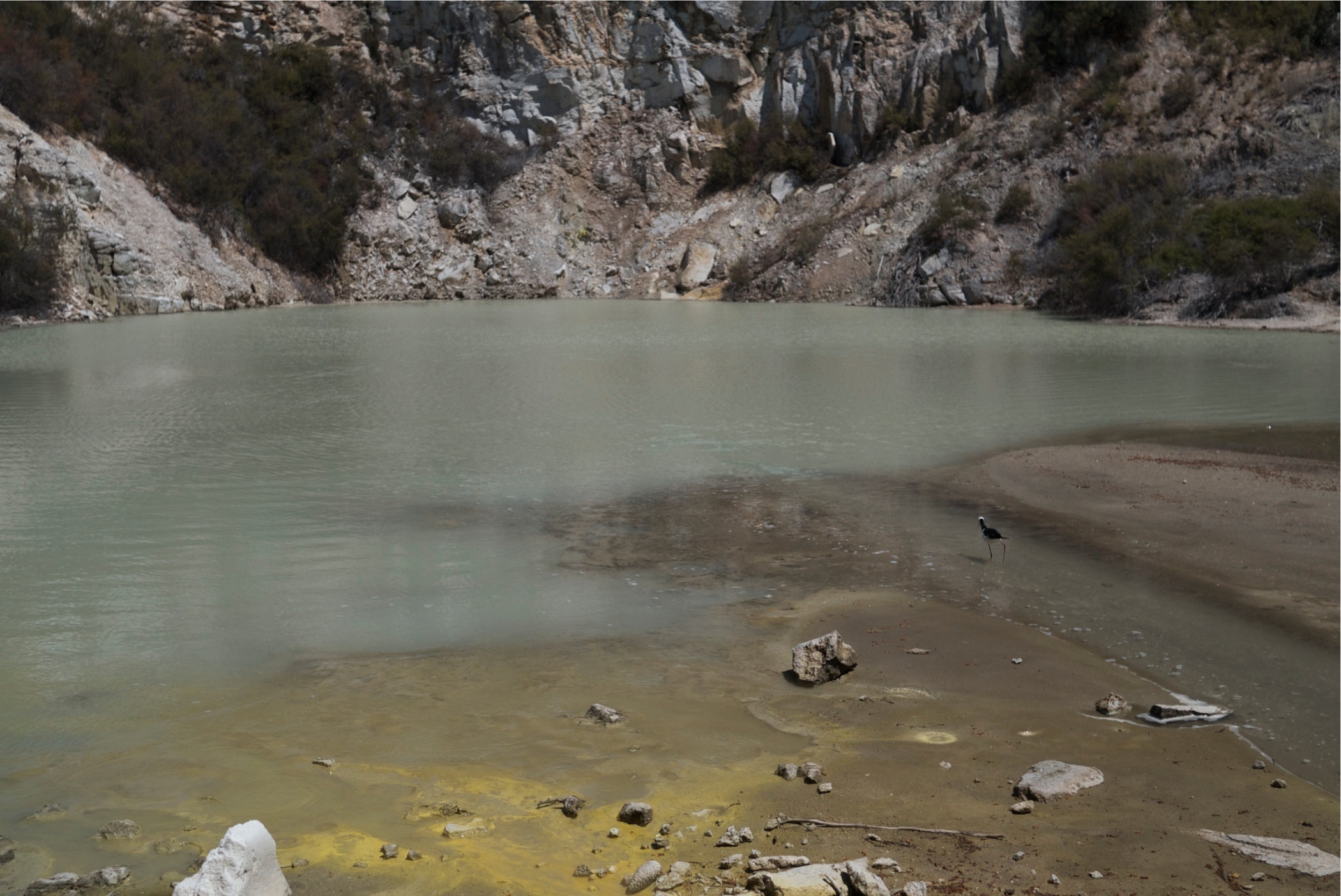 Part of the Frying Pan Flats the bird is a Pied Stilts and eats the insects, they don't seem to have a problem with the water which is acidic.