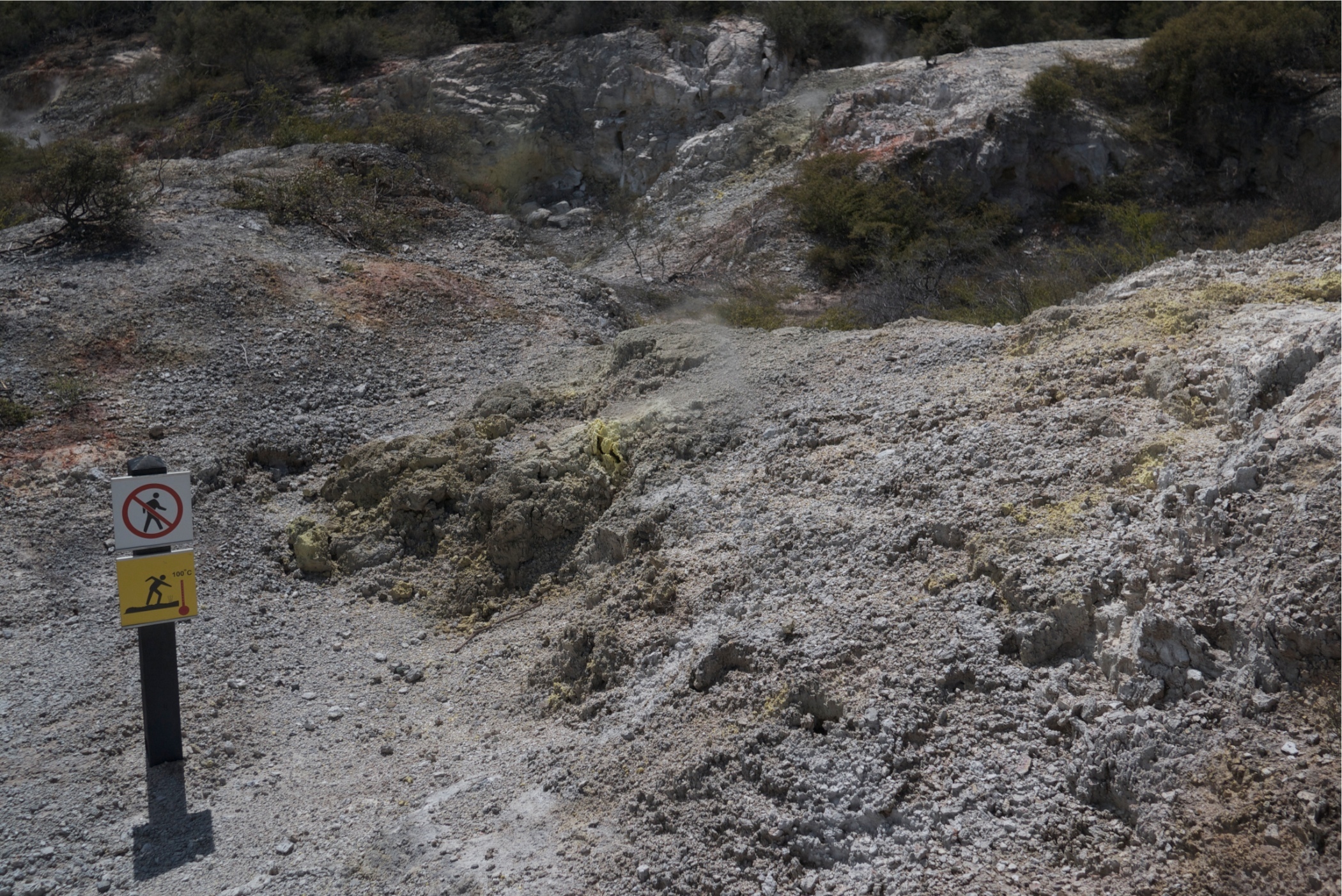 The yellow mounds are sulphur mounds and were formed under water but where the river was drained they were exposed.