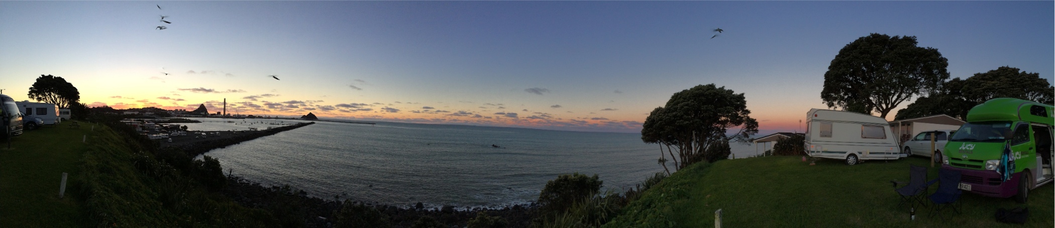 Arrived in New Plymouth in just enough time to see the sun set. Drank wine and annoyed a couple in a chalet who had been enjoying the view until we turn up and parked right in front of it. Cooked my first meal in Betty food was delicious but the smoke from cooking was a little over powering.